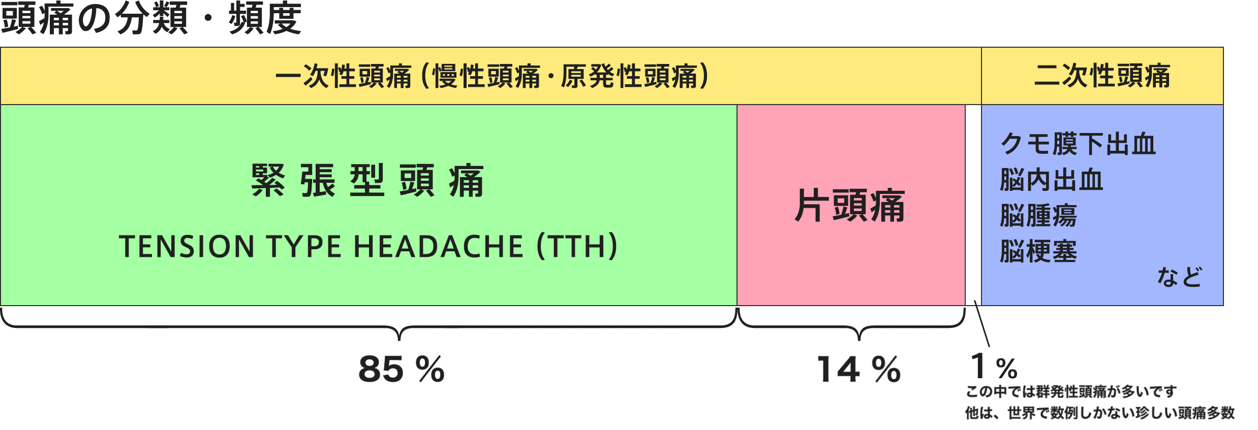 頭痛には、脳腫瘍や脳出血など、別の原因に付随して起こる特殊な二次性頭痛と頭痛が主体で単独で起こる、一次性頭痛(慢性・原発性)があります。通常、頭痛というとこの一次性頭痛の事を言います。一次性頭痛の約80%以上を占めるのが、緊張型頭痛(tension type headache:TTH)です。